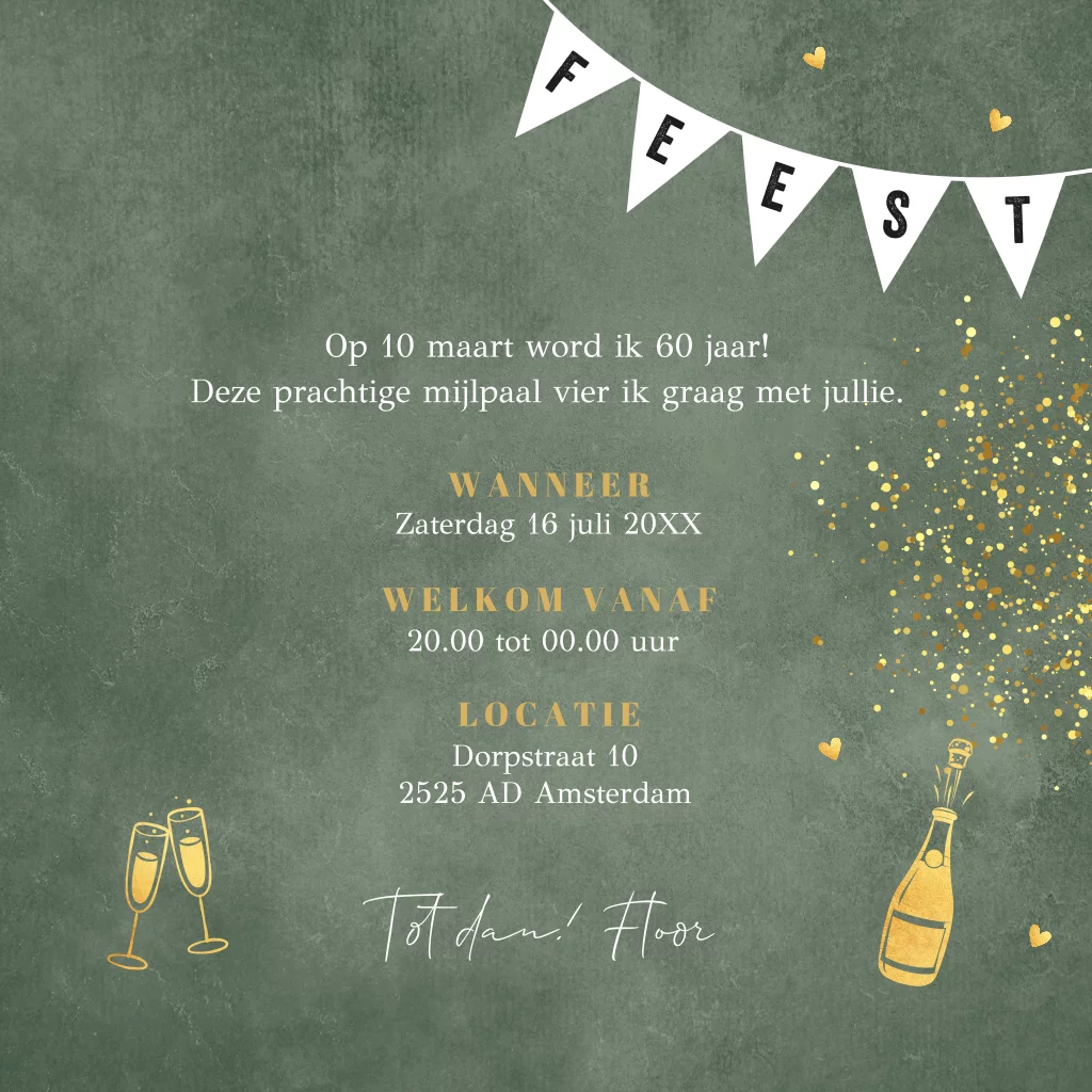 Uitnodiging verjaardag 60 jaar groen met foto's, goudlook champagne, slinger en feestelijke confetti. Geen folie!