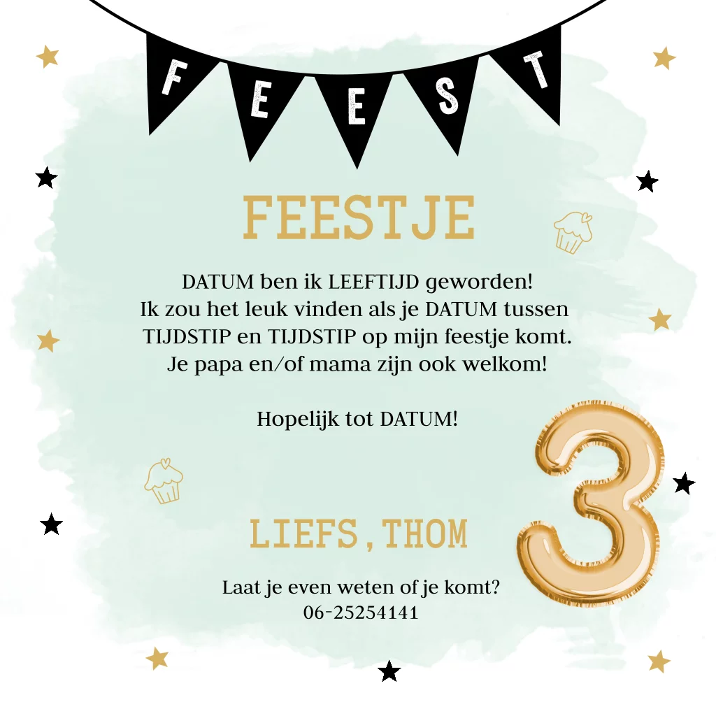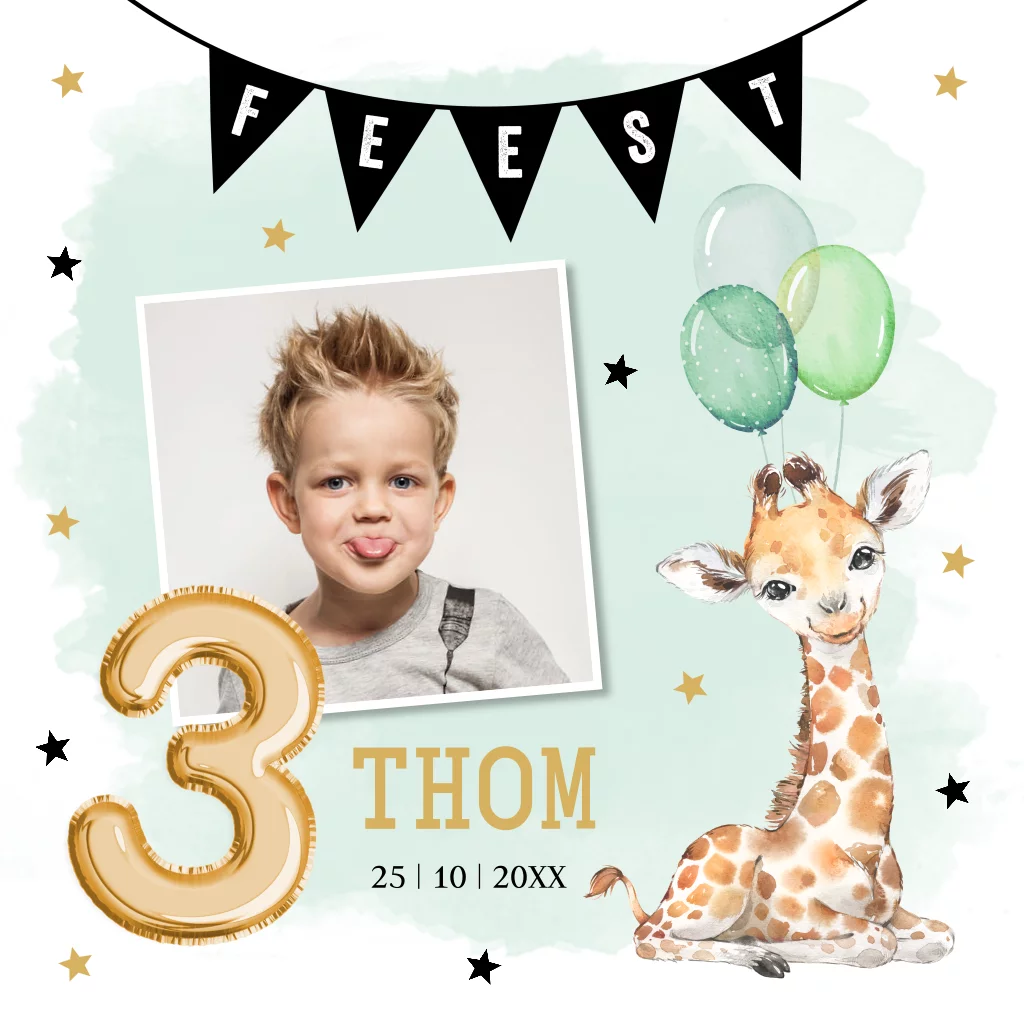 Uitnodiging kinderfeestje voor een jongen 3 jaar met foto, waterverf, slinger, ballonnen en giraffe.