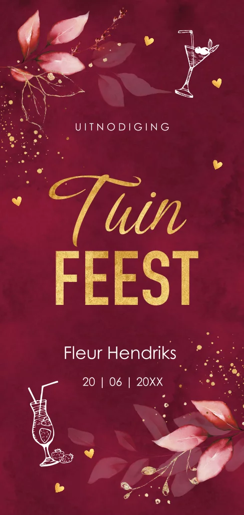 Uitnodiging tuinfeest langwerpig rood met bladeren, cocktails en goudlook. Geen folie!