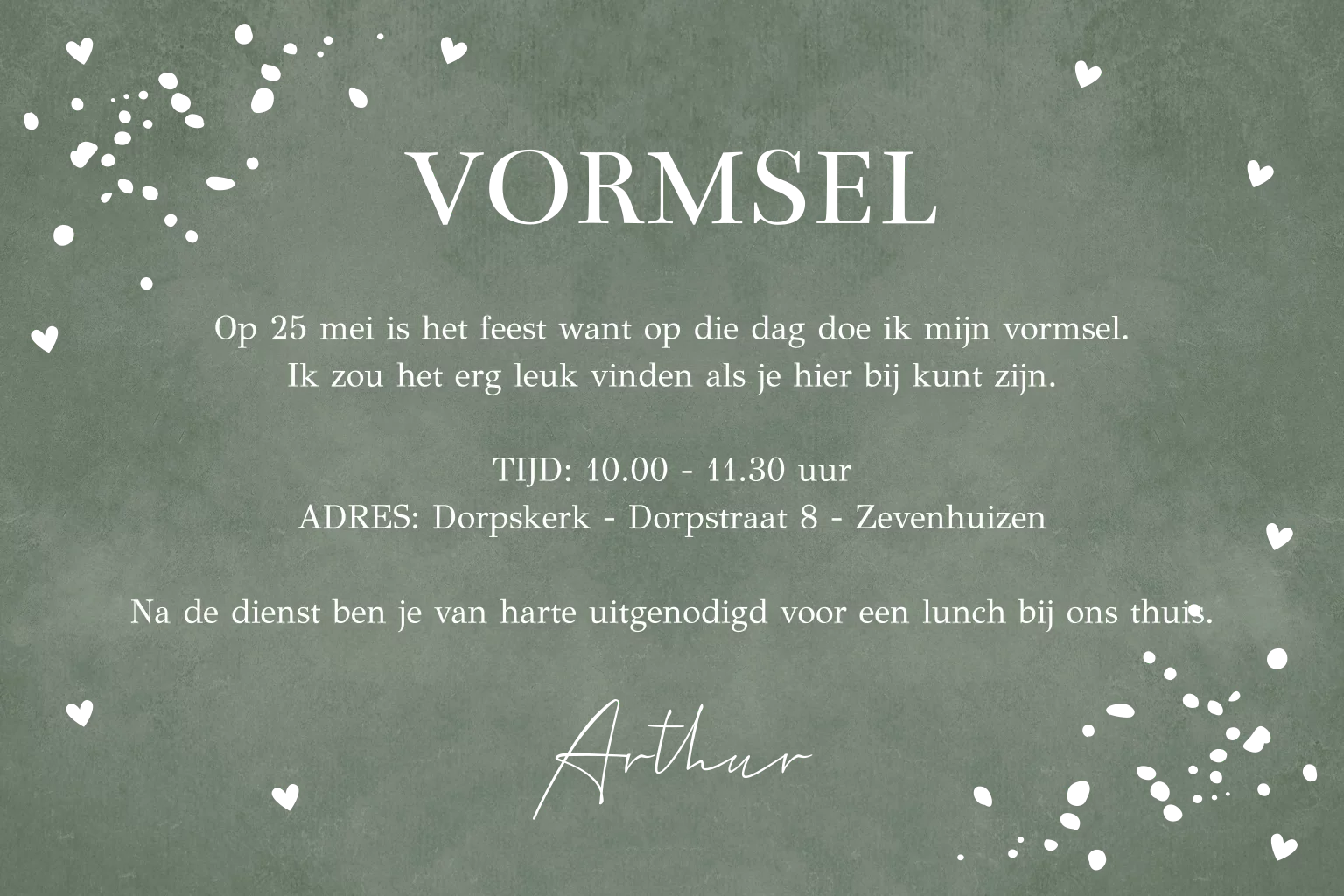 Uitnodiging vormsel voor een jongen groen met fotocollage en goudfolie.