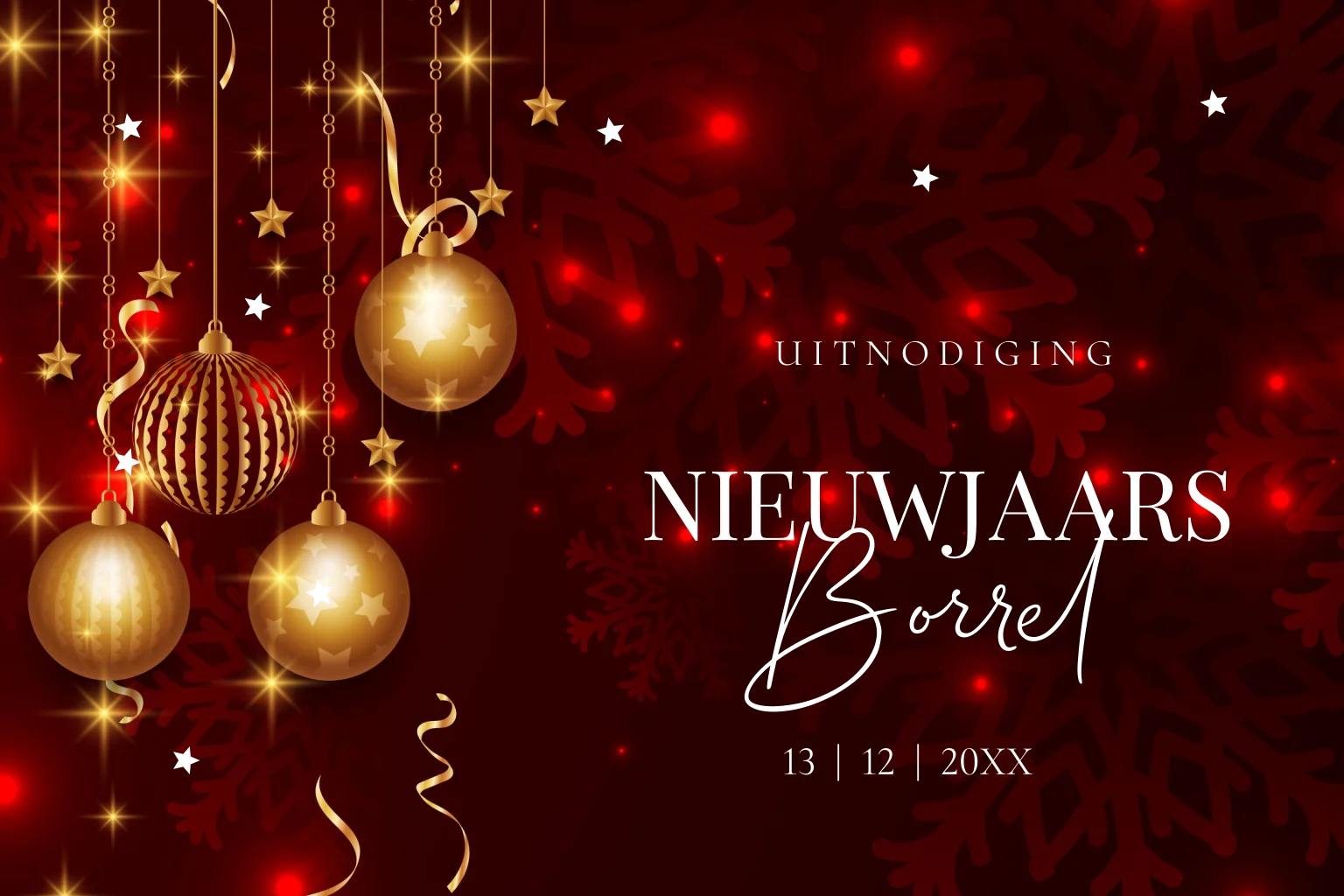 Uitnodiging zakelijke nieuwjaarsborrel feestje rood met goudfolie.