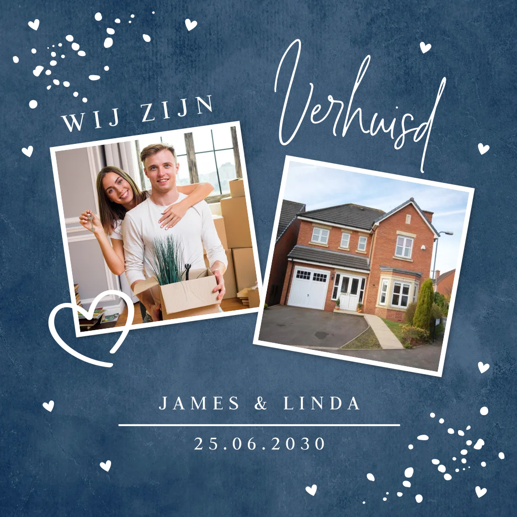 Leuke trendy verhuiskaart blauw met foto's en goudfolie.