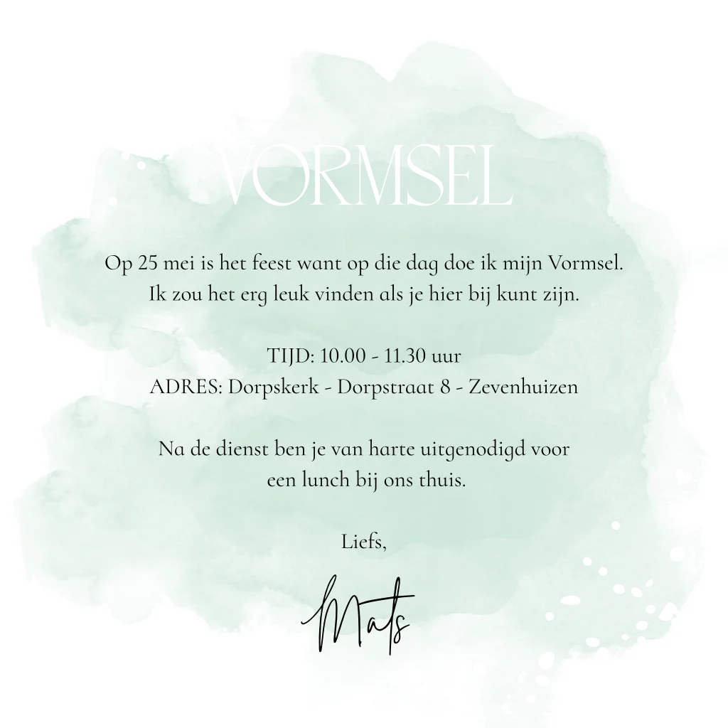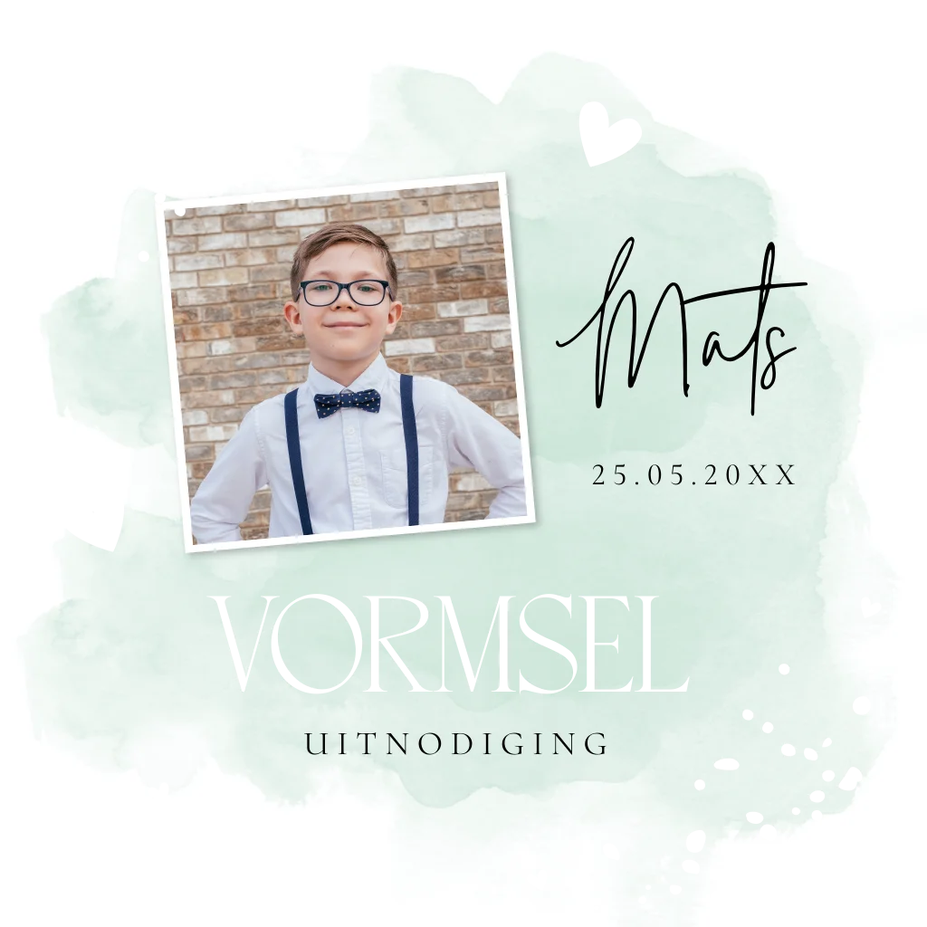 Vormsel uitnodiging voor een jongen met groene waterverf, foto en hartjes & goudfolie.