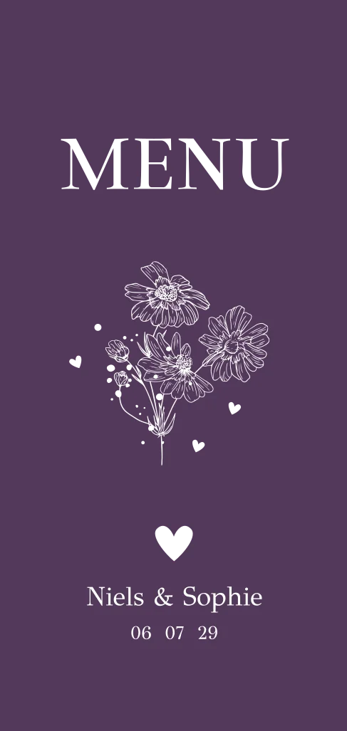 Stijlvolle menukaart paars met bloemenboeket en goudfolie.