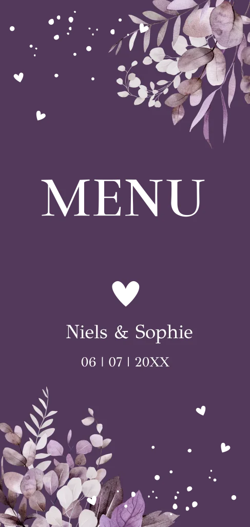 Stijlvolle menukaart paars botanisch met bladeren en goudfolie.