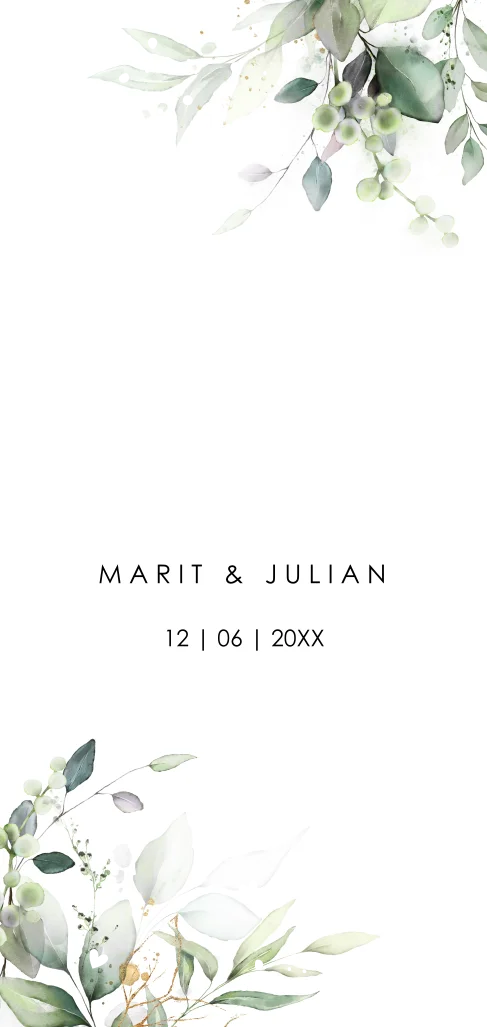 Menukaart huwelijk langwerpig in botanische stijl en goudfolie.