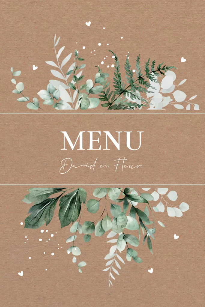 Menukaart huwelijk botanisch met groene bladeren, kraftlook en goudfolie.
