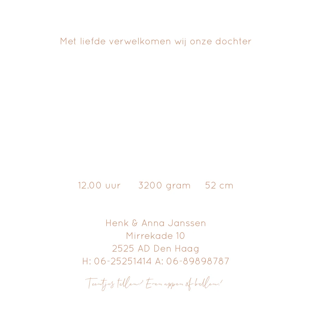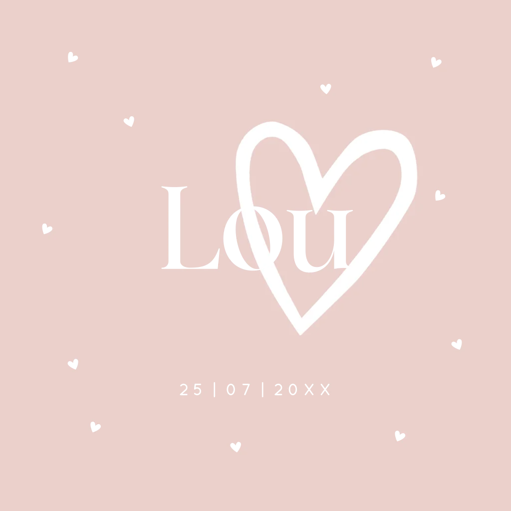 Clean geboortekaartje voor een meisje met zacht roze, hartjes en goudfolie.