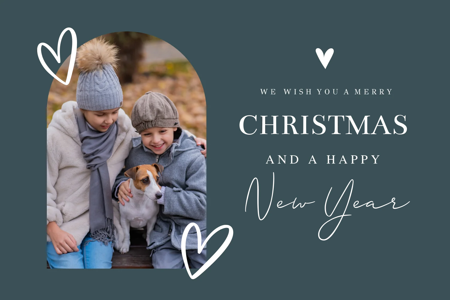 Stijlvolle kerstkaart blauw foto boog hartjes goudfolie