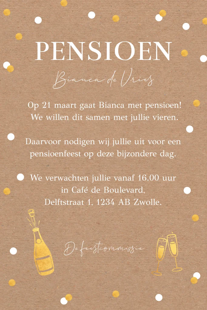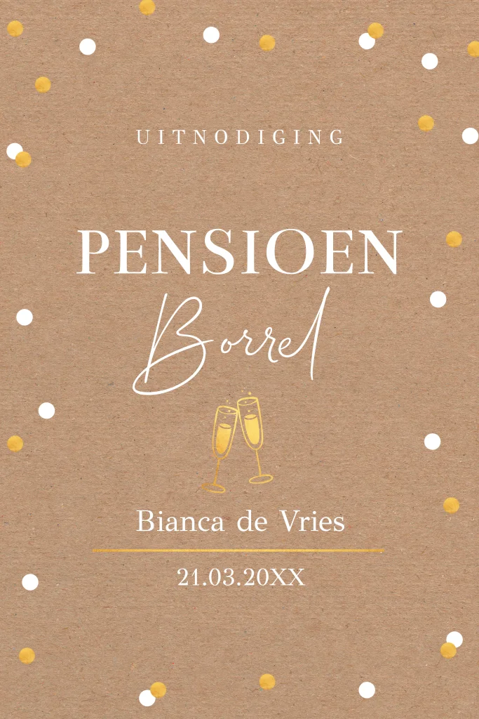 Pensioen uitnodiging met kraftlook goudlook confetti en champagne. Geen folie!