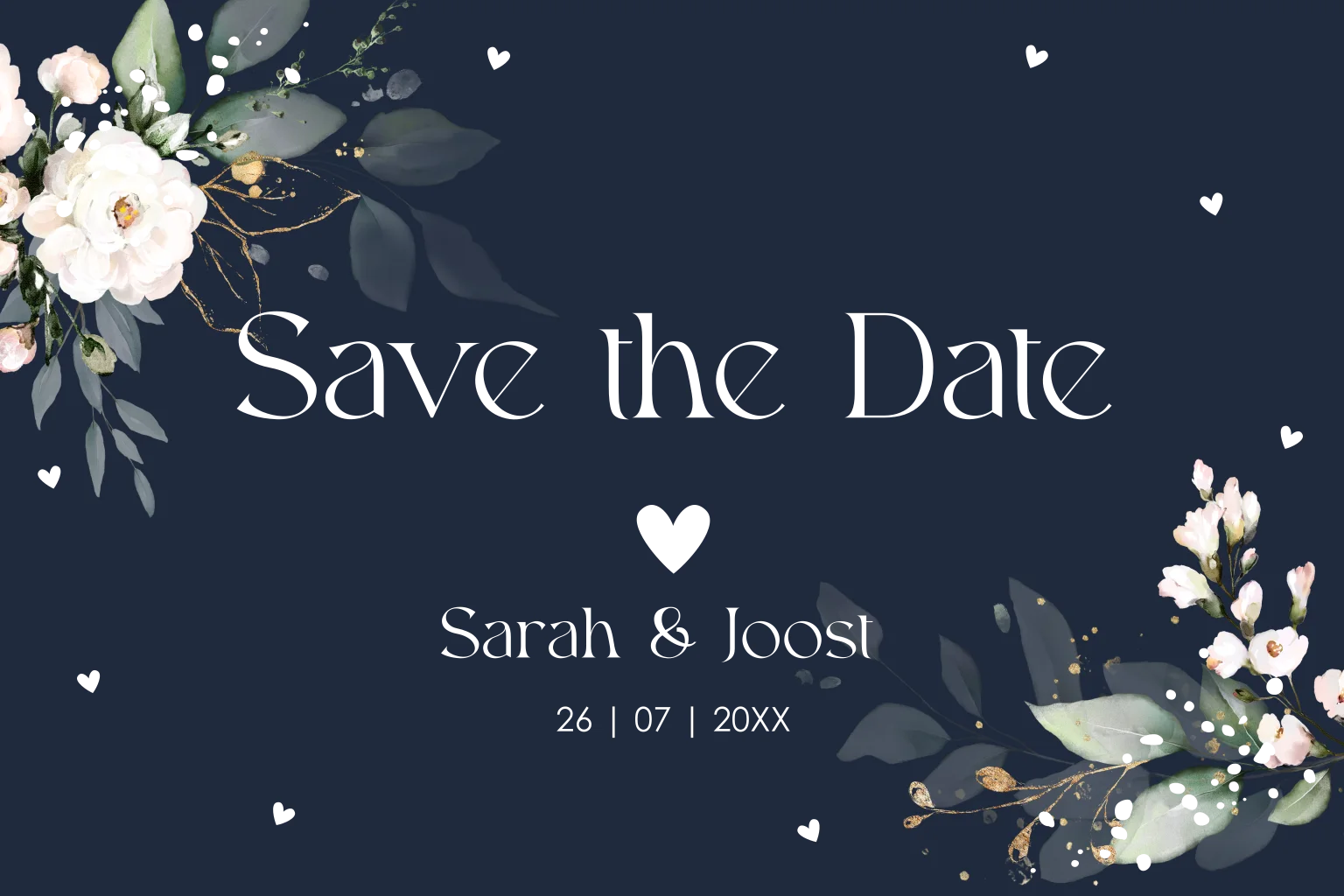 Save the Date kaart donkerblauw botanisch bloemen wit