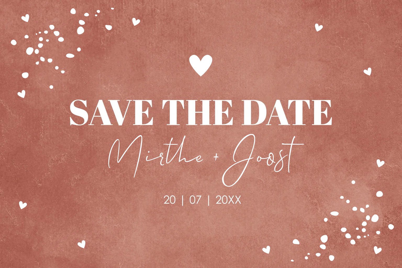 Moderne Save the Date kaart terracotta roze met goudfolie. Maak jullie trouwdatum bekend met deze originele Save the Date kaart!