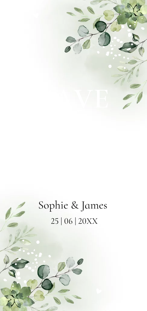 Stijlvolle save the date uitnodiging langwerpig botanisch met groene bladeren en goudfolie. Maak jullie trouwdatum bekend met deze prachtige romantische save the date!