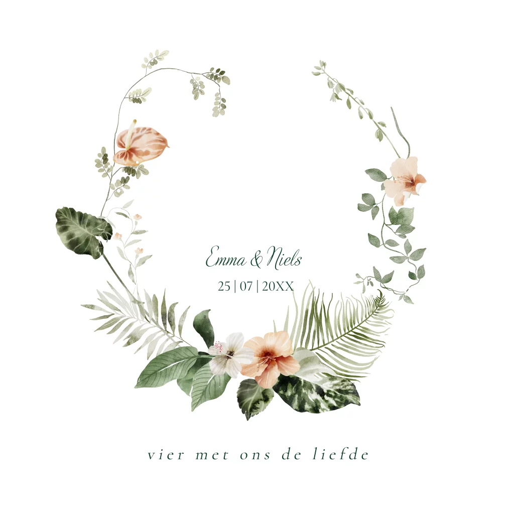 Save the Date kaart foto rond tropische bladeren rosegoudfolie