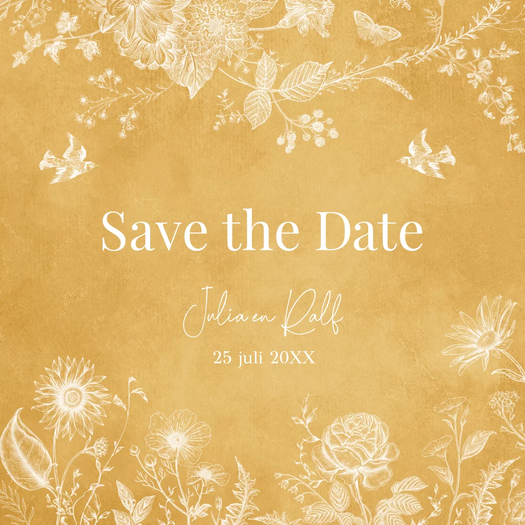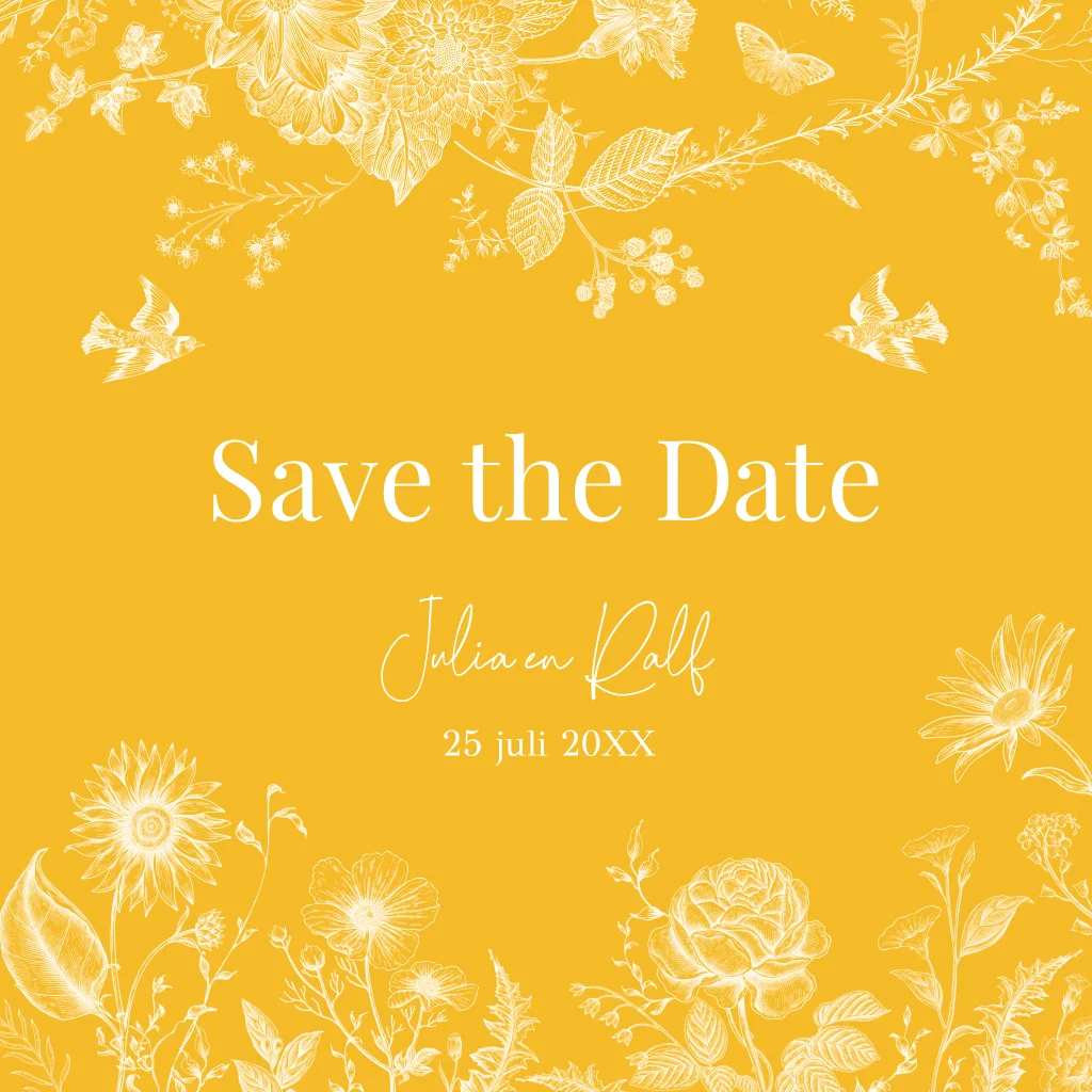 Save the Date kaart geel met mooie bloemen. Stuur deze mooie Save the Date kaart naar jullie gasten om de trouwdatum bekend te maken. Pas de kleuren naar wens aan!