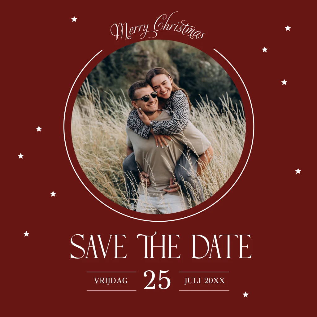 Save the Date kerstkaart rood foto rond sterren goudfolie