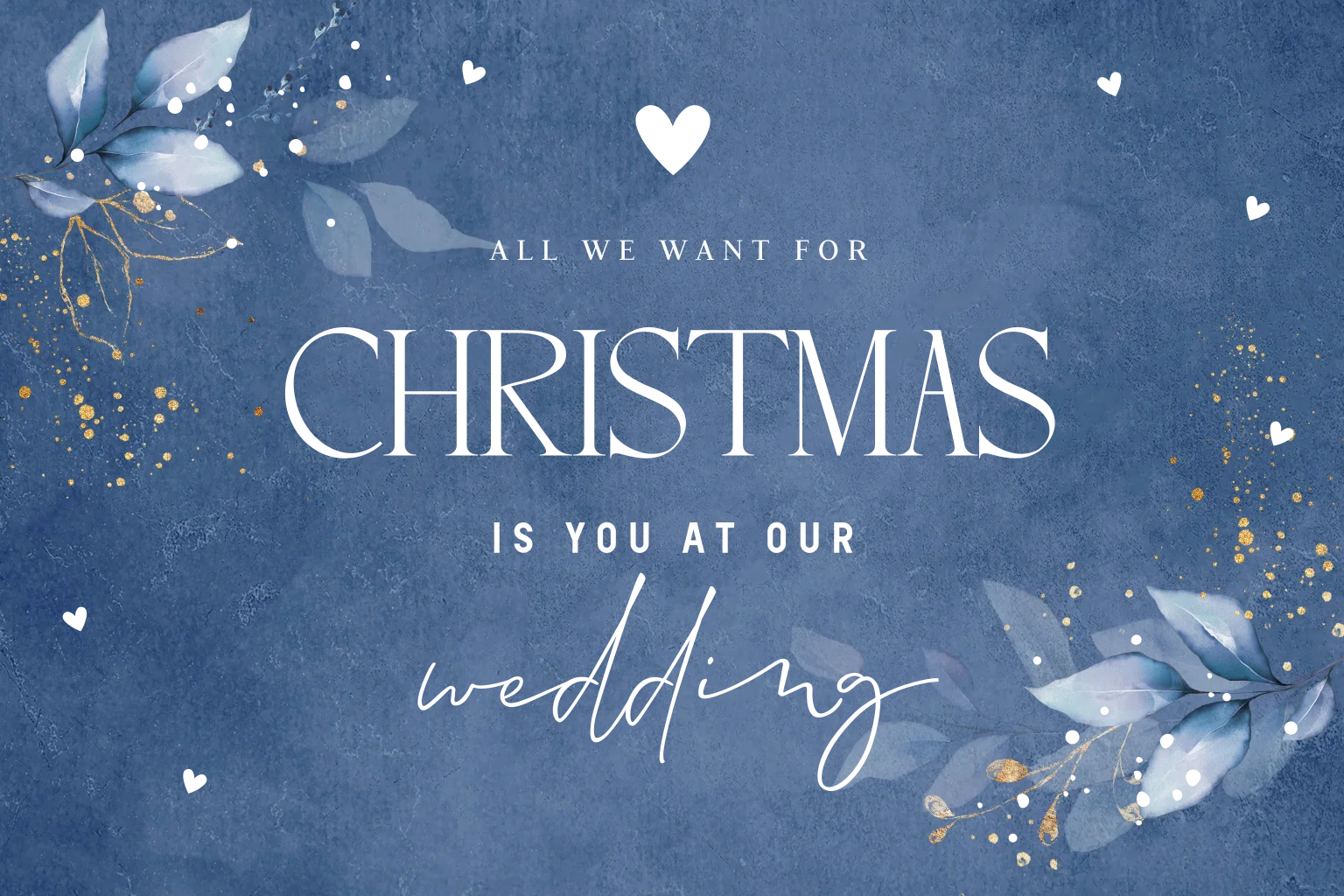 Save the Date kerstkaart blauw met botanische blaadjes en goudfolie. Pas de kleur van de folie zelf eenvoudig aan.