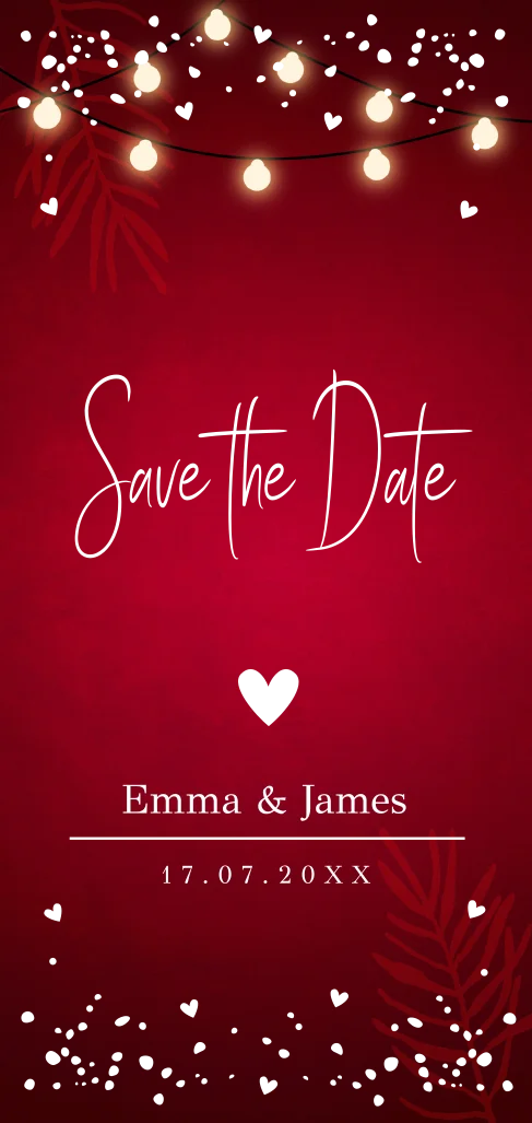 Save the Date kerstkaart rood lampjes goudfolie