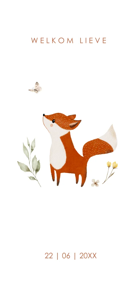 Lief geboortekaartje wit langwerpig met vosje en goudfolie.