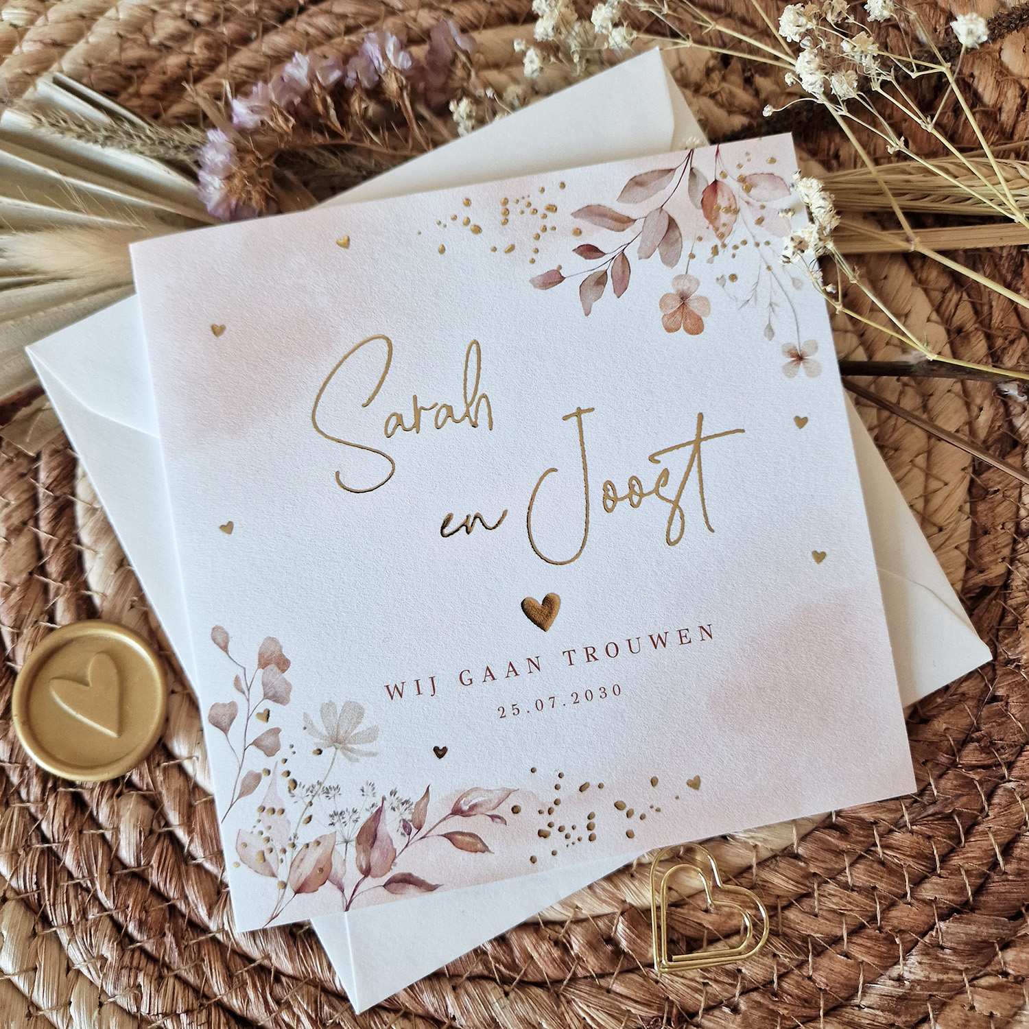 Stijlvolle unieke trouwkaart terracotta beige bloemen, met roze watercolour en goudfolie. In de binnenkant staan trouw symbooltjes en eigen foto.