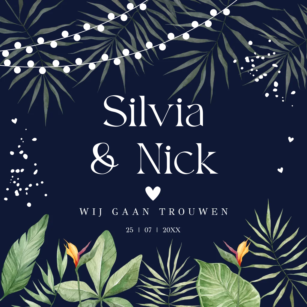 Trouwkaart met tropische bladeren, lampjes en goudfolie. In de binnenkant staan leuke trouw icoontjes en een foto.