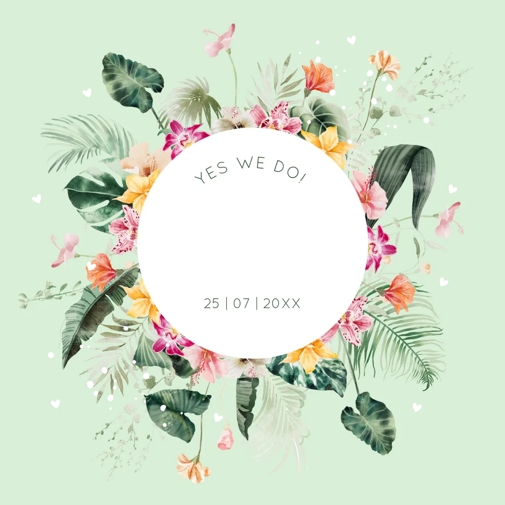Trouwkaart lichtgroen met tropische bloemen en goudfolie. In de binnenkant staan leuke trouw icoontjes en een foto.