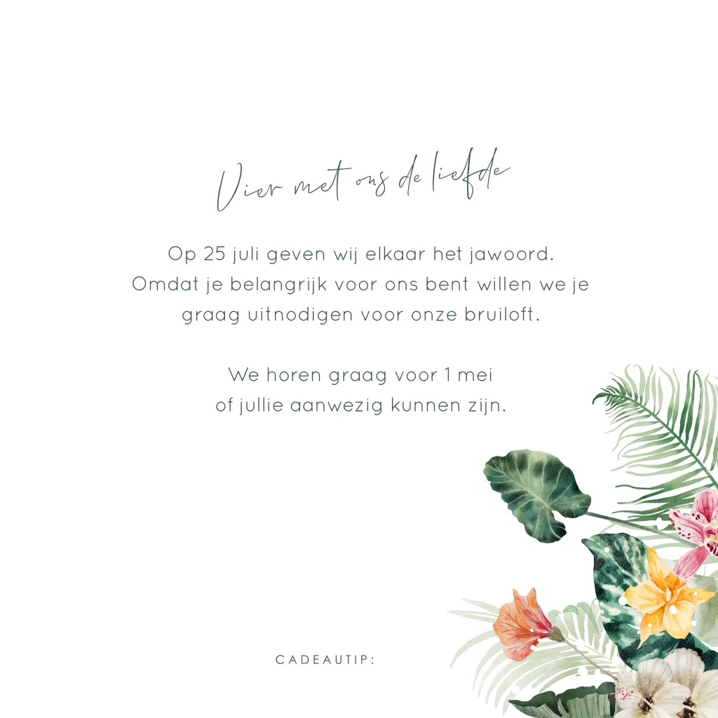 Trouwkaart lichtgroen tropische bloemen goudfolie