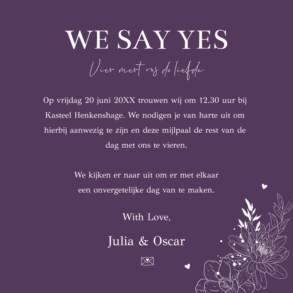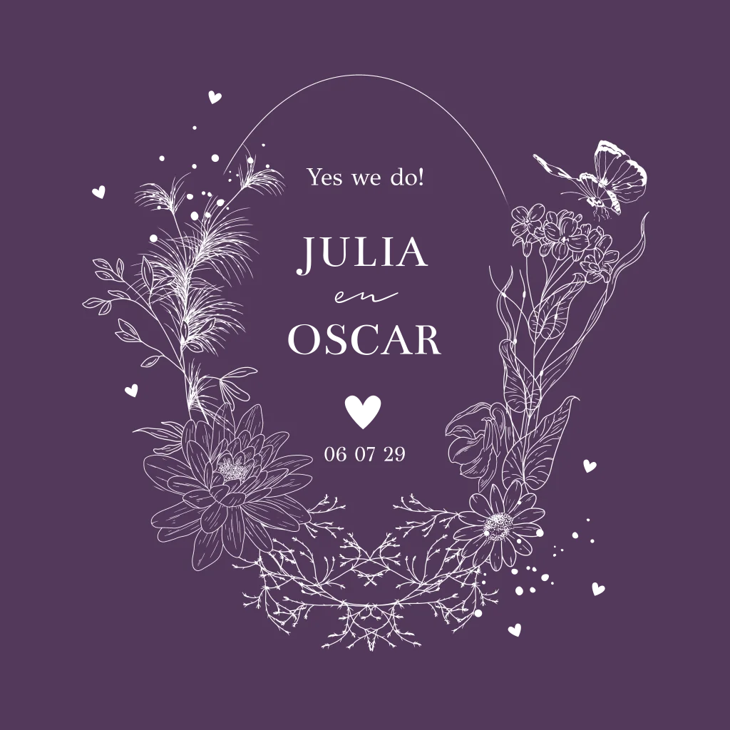 Stijlvolle trouwkaart paars met bloemenkrans en goudfolie. Nodig jullie gasten in stijl uit met deze prachtige paarse trouwkaart.