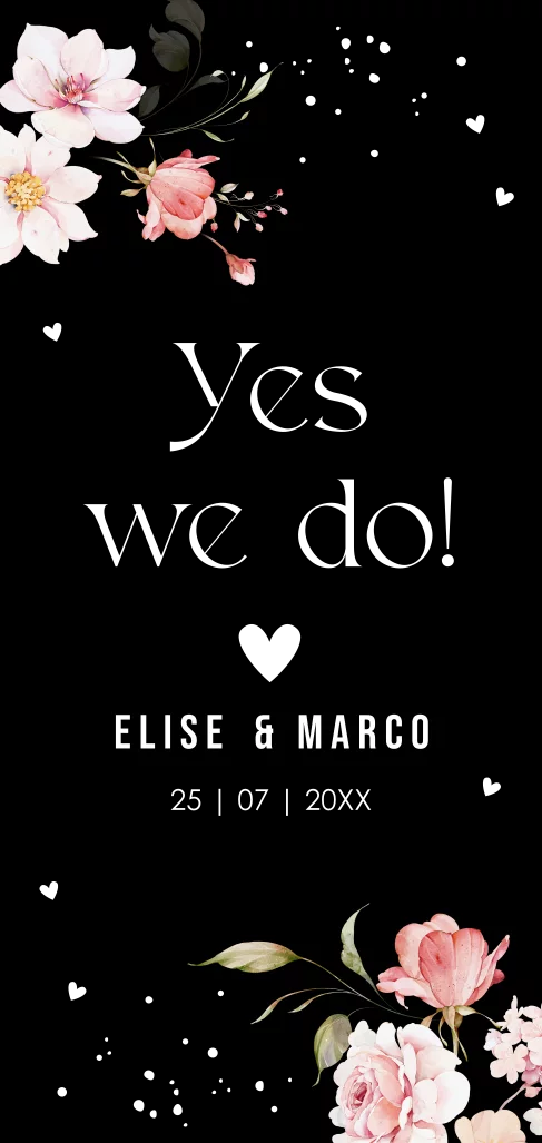 Trouwkaart zwart langwerpig met roze bloemen en rosegoudfolie.
