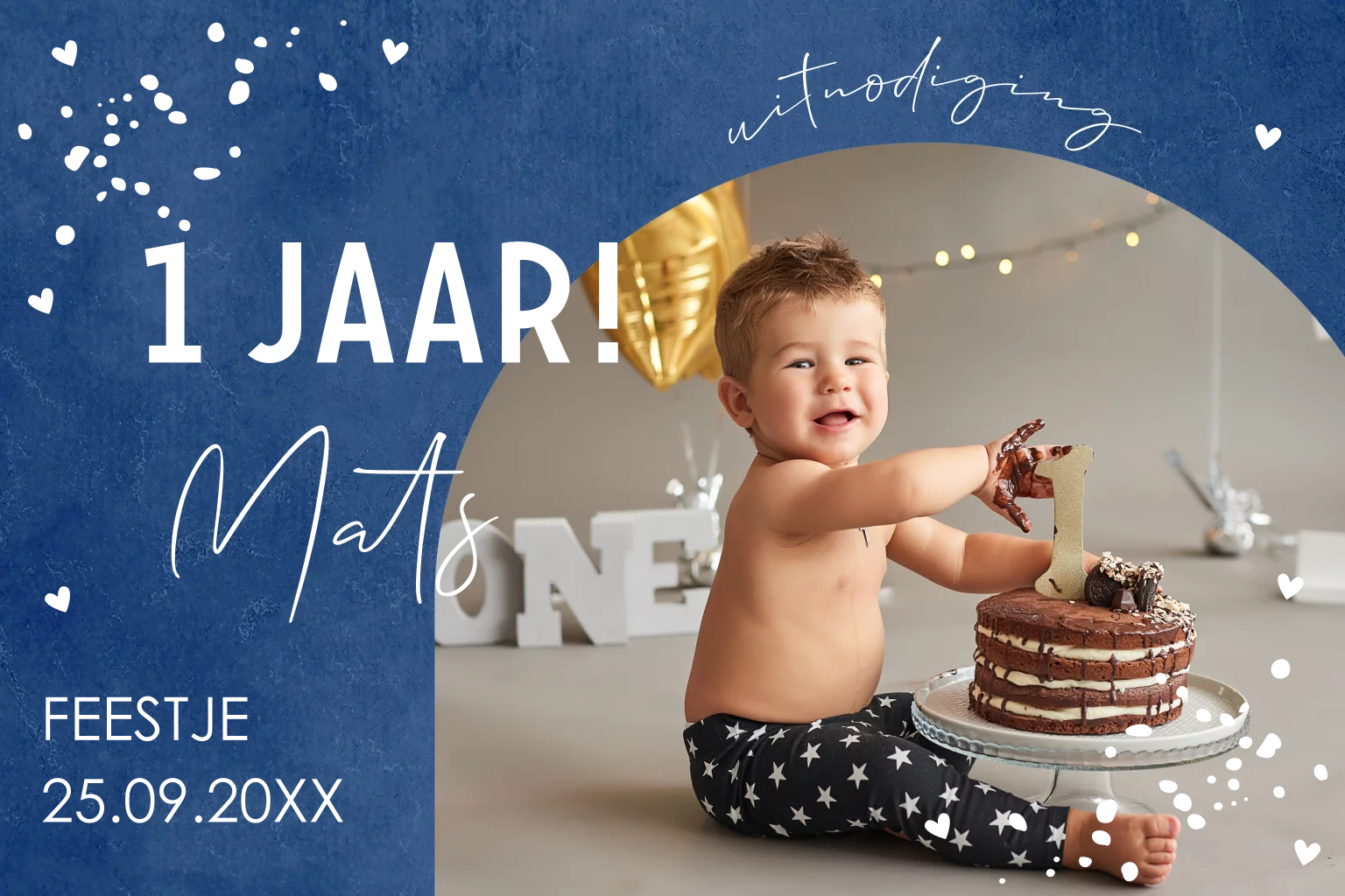 Uitnodiging kinderfeestje blauw jongen 1 jaar foto goudfolie