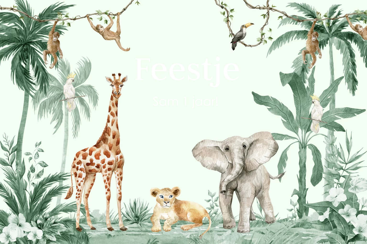 Uitnodiging kinderfeestje jongen 1 jaar jungle dieren groen goudfolie