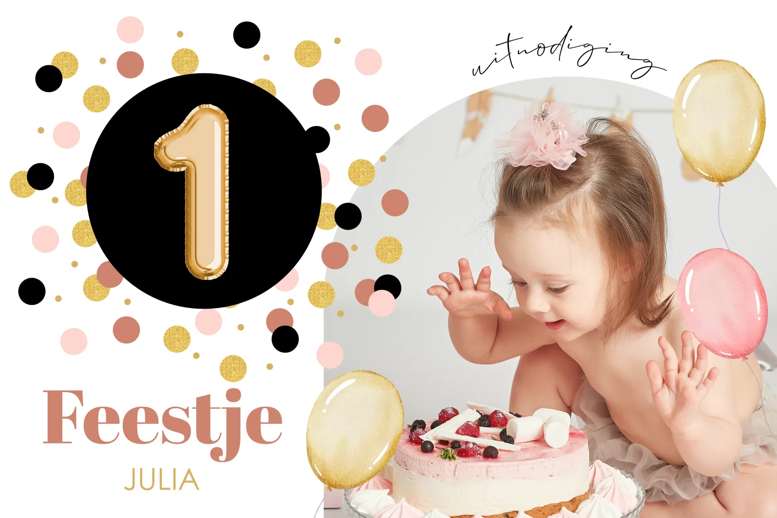 Uitnodiging kinderfeestje voor een meisje 1 jaar met foto in boog vorm, gekleurde dots roze goud en ballonnen.