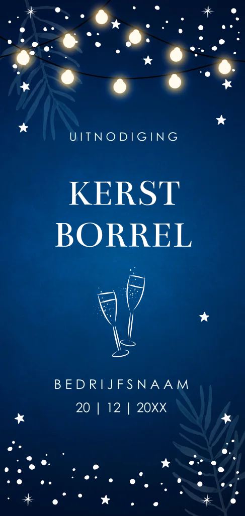 Zakelijke kerstborrel uitnodiging blauw langwerpig met spetters, champagneglazen en goudfolie.