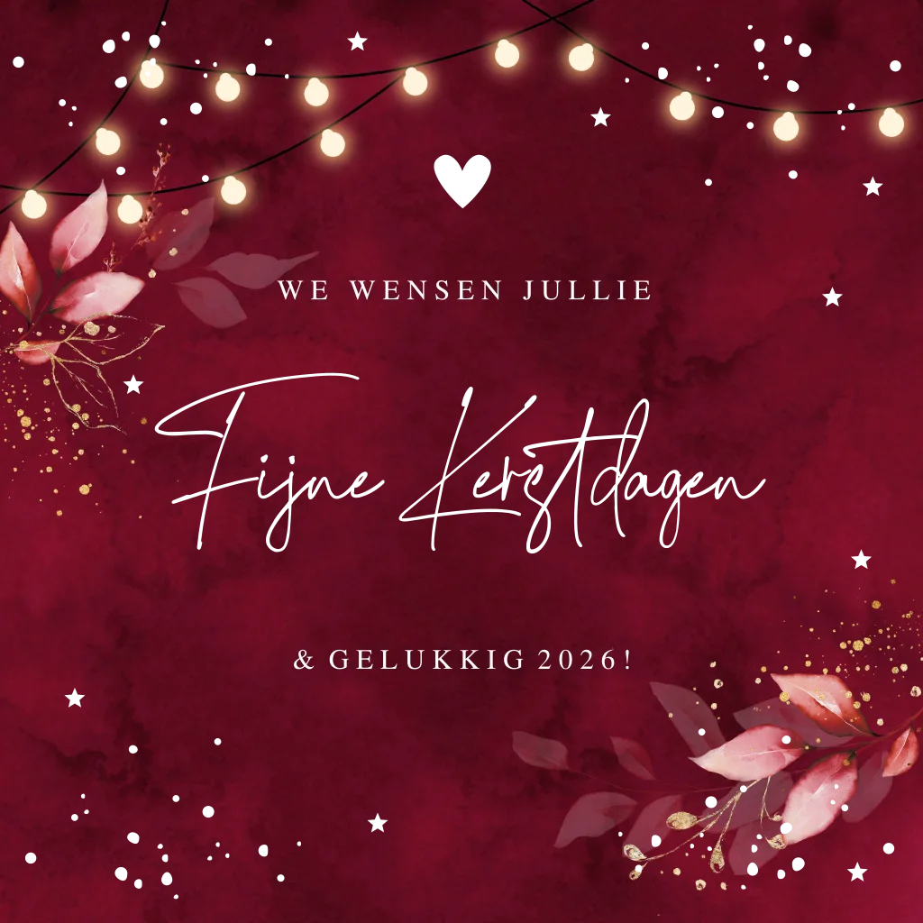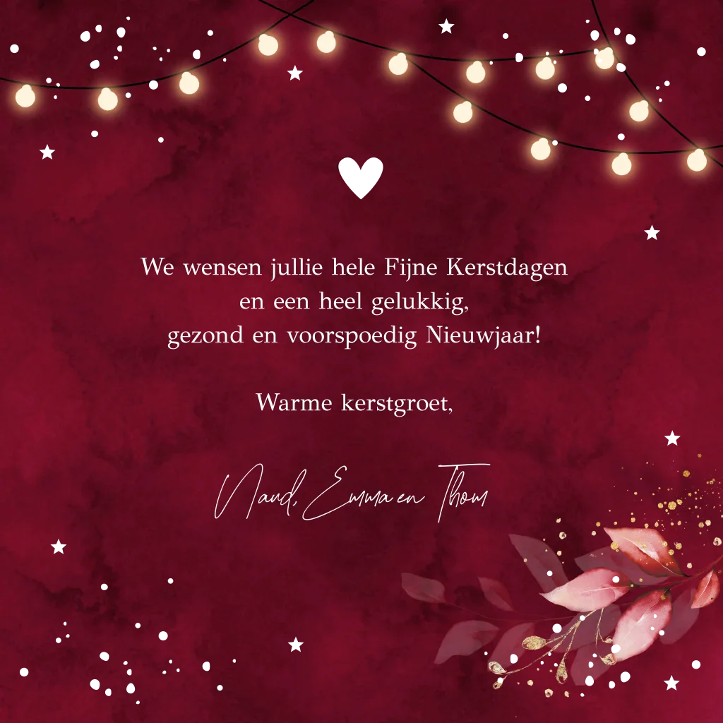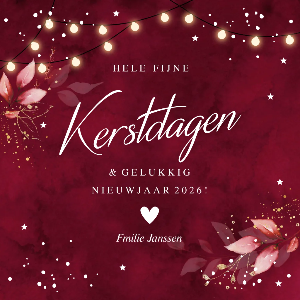 Stijlvolle kerstkaart rood met sfeervolle lampjes, floral bladeren spetters, mooie typografie en goudfolie.