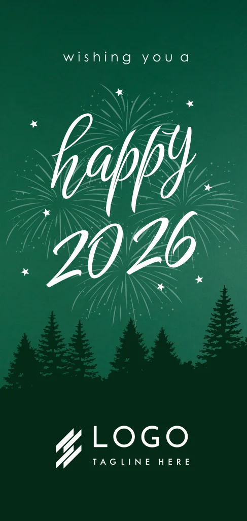 Zakelijke nieuwjaarskaart langwerpig groen met Happy 2026, winterlandschap, logo en goudfolie.