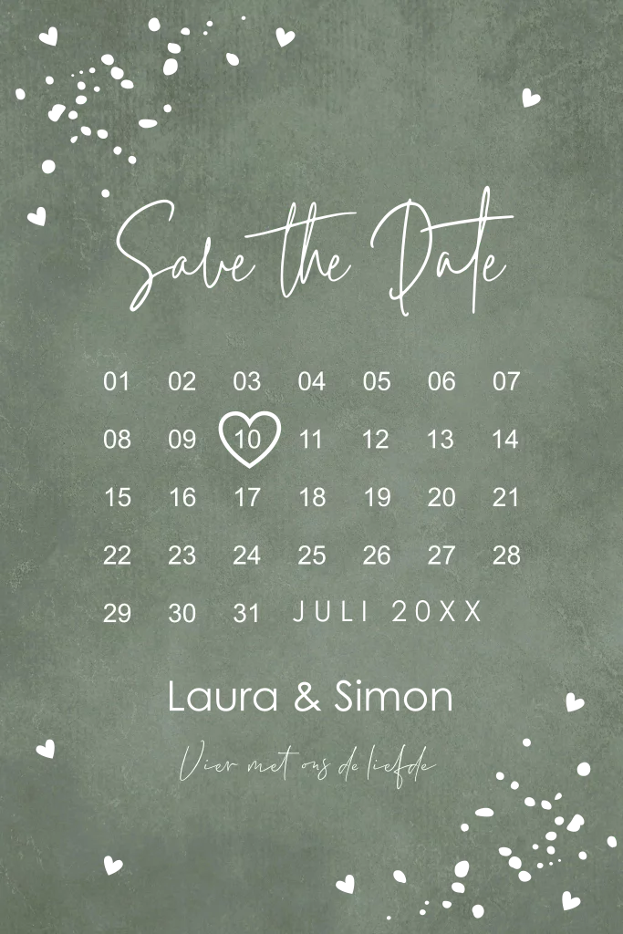 Save the Date kaart kalender groen hartjes goudfolie