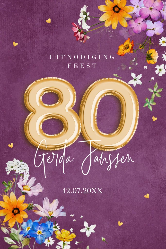 Uitnodiging verjaardag 80 jaar vrouw bloemen paars