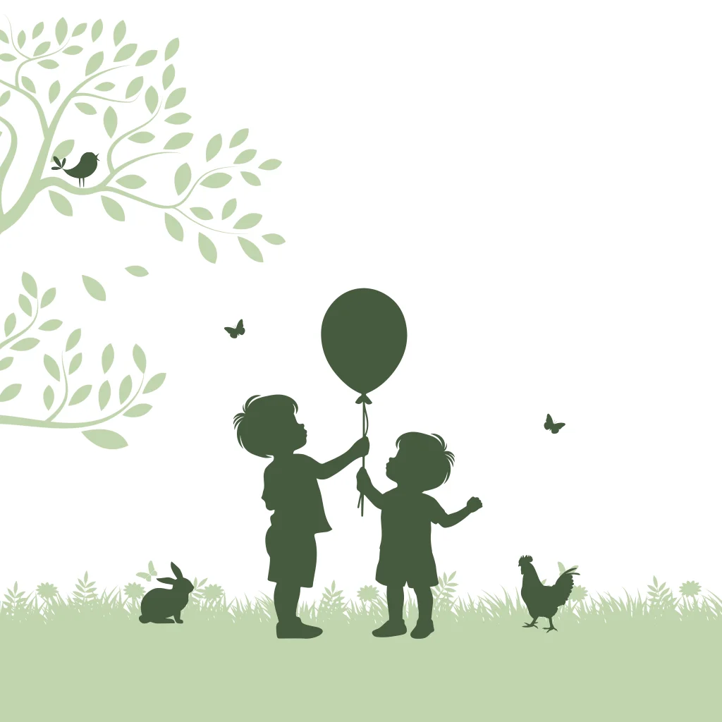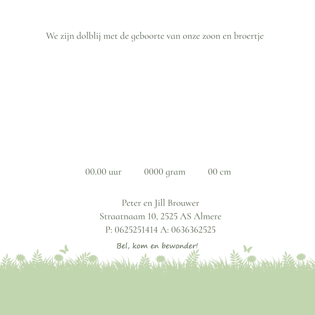 Lief geboortekaartje voor een broertje met grote broer omringd door bomen, dieren en bloemen.