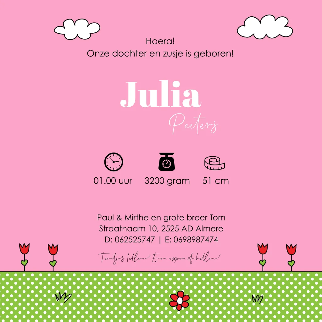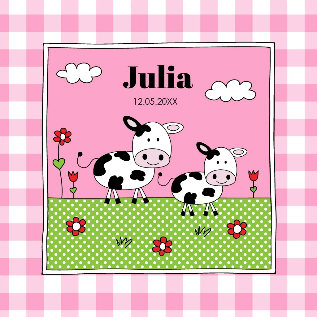 Geboortekaartje voor een zusje met koeien omringd door wolkjes en bloemen.