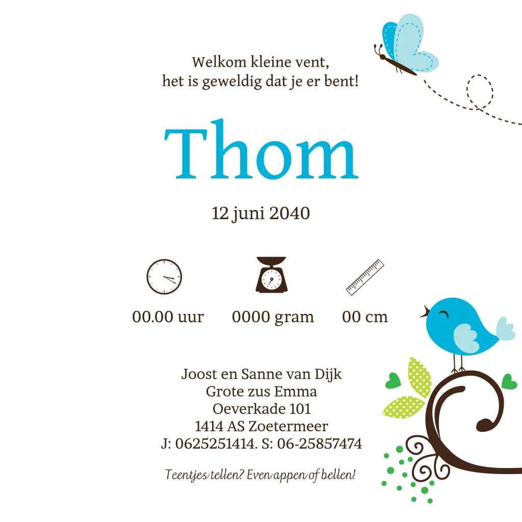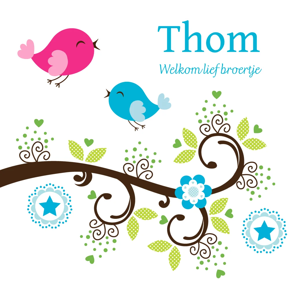 Een geboortekaartje met twee vogeltjes bij een boom met blaadjes en hartjes.