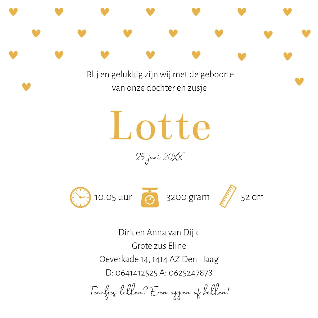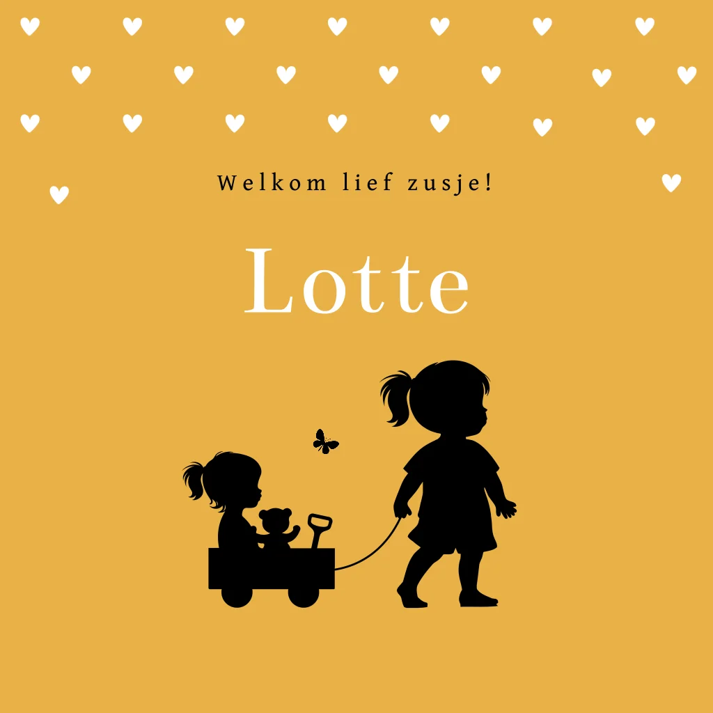 Geboortekaartje silhouet zusje en grote zus in karretje okergeel.