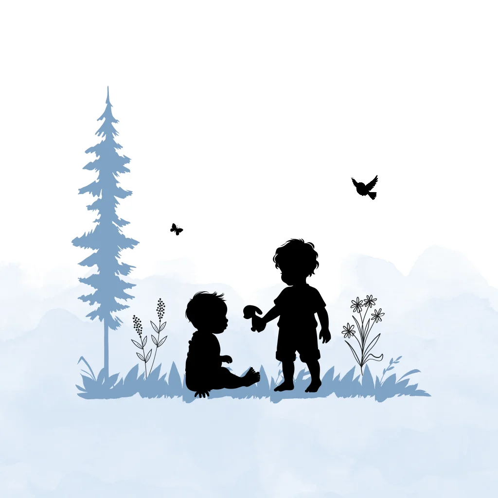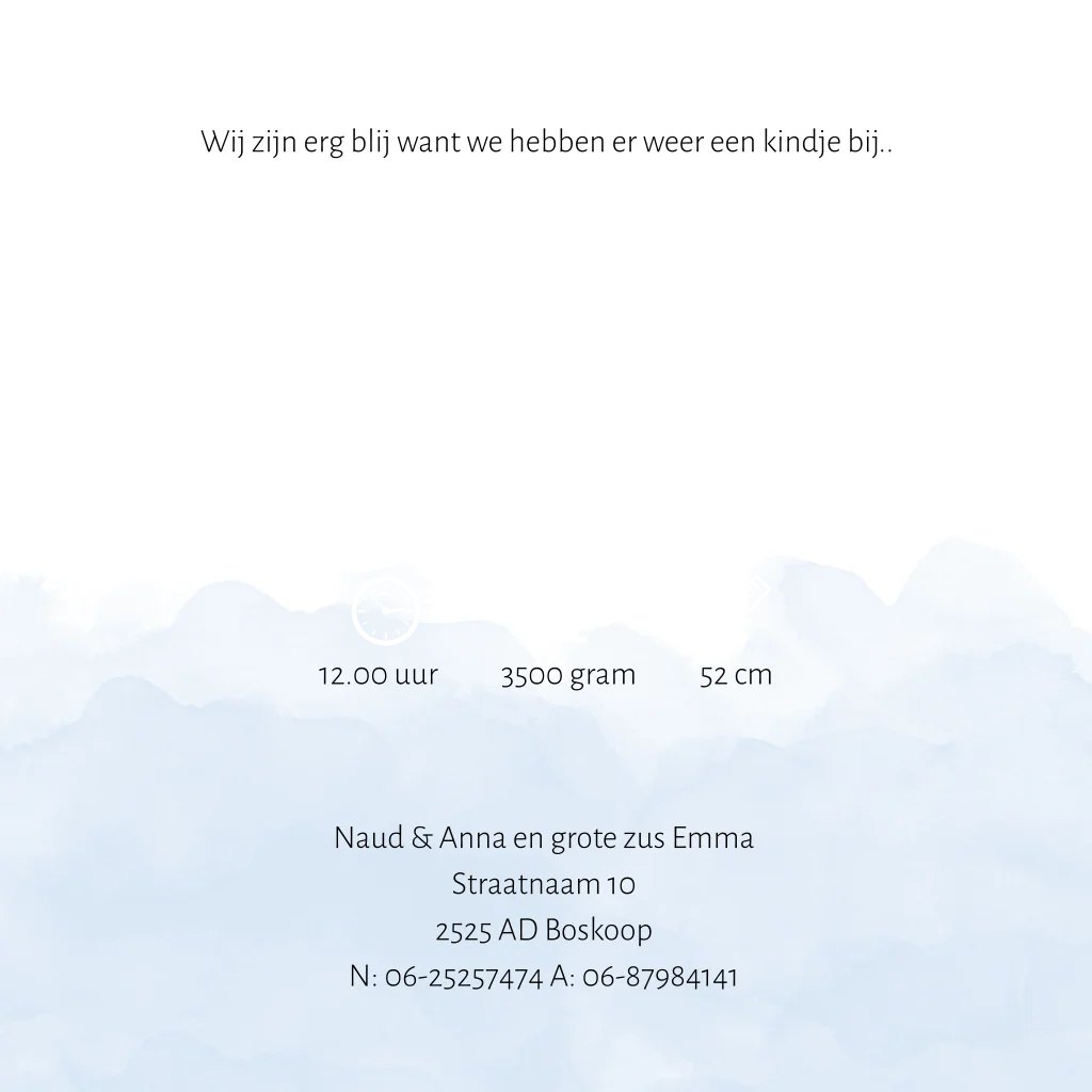 Geboortekaartje met silhouet broertje en grote broer, blauw met waterverf en goudfolie.