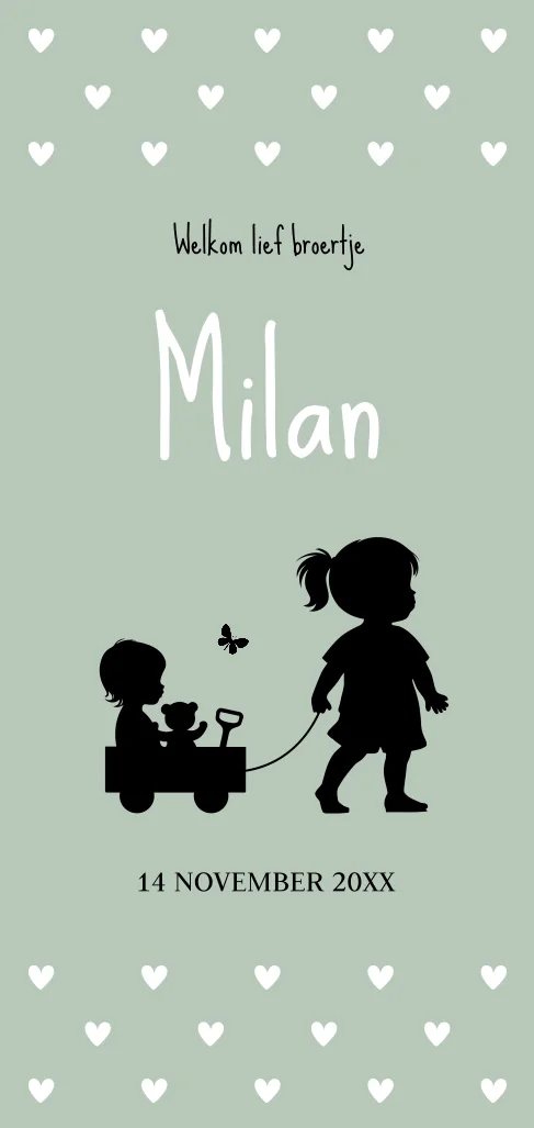 Geboortekaartje met silhouet broertje en grote zus in karretje.