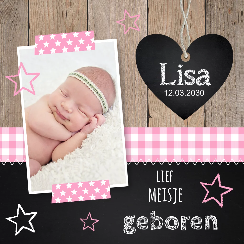 Geboortekaartje met foto, hartje en houtprint.