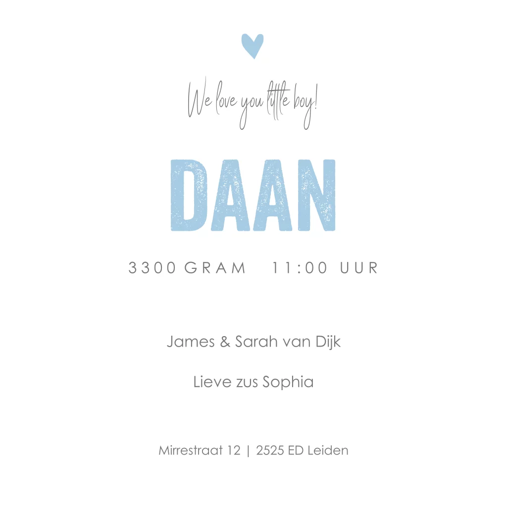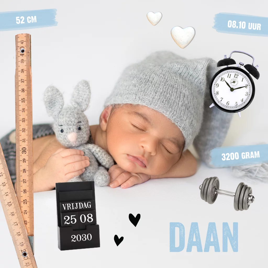 Trendy geboortekaartje met foto en kalender, meetlint, gewicht en wekker.