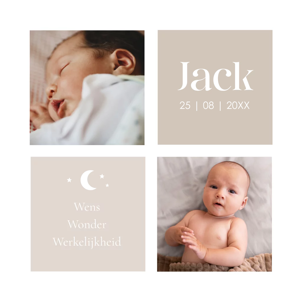 Geboortekaartje voor een jongen of meisje met beige vlakken, foto 's, maantje en sterren met goudfolie.