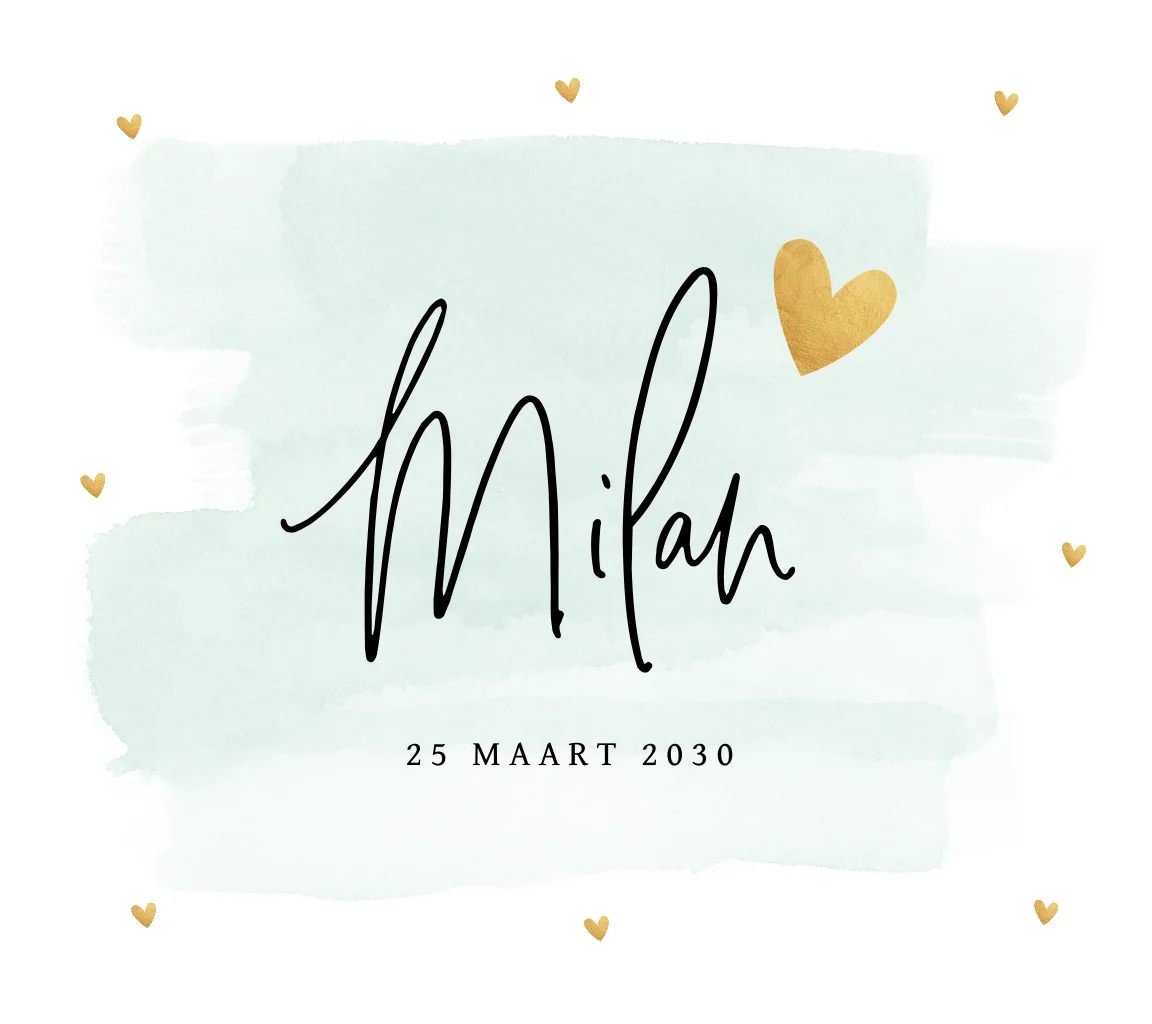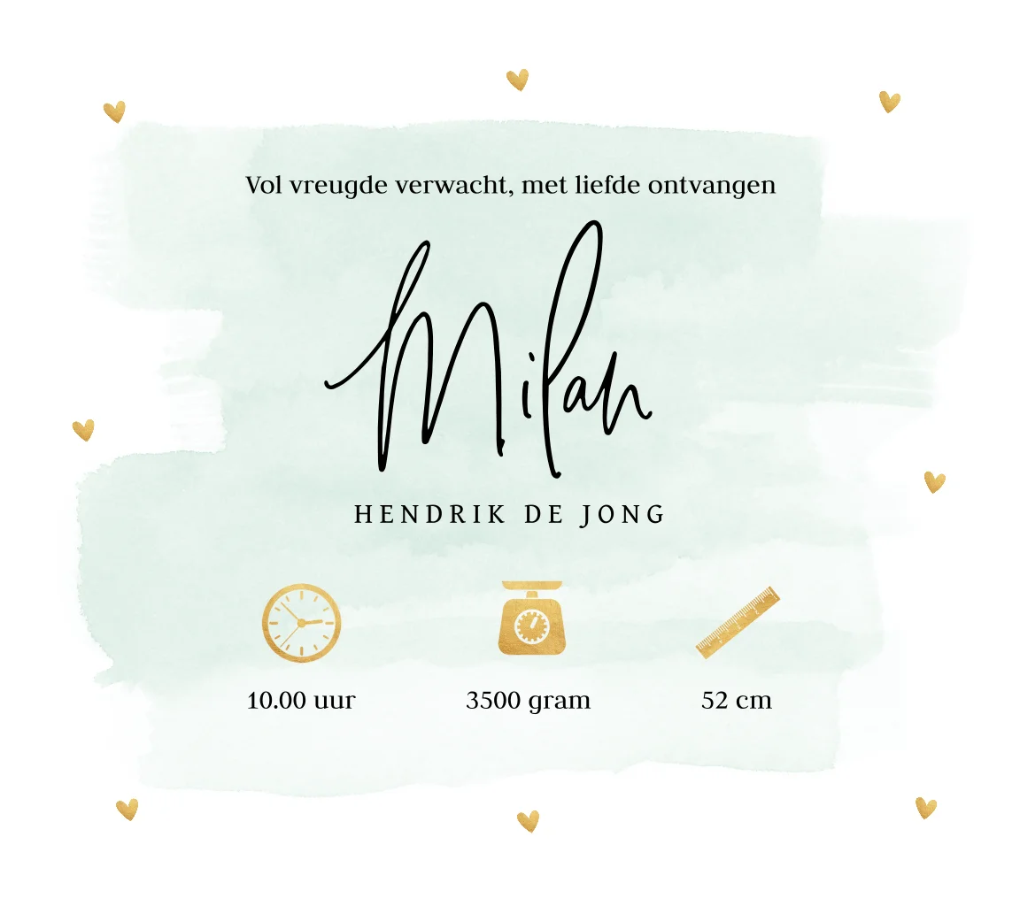 Geboortekaartje voor een jongen met waterverf mintgroen en goudlook hartjes op Belgisch formaat. Geen goudfolie/inkt!
