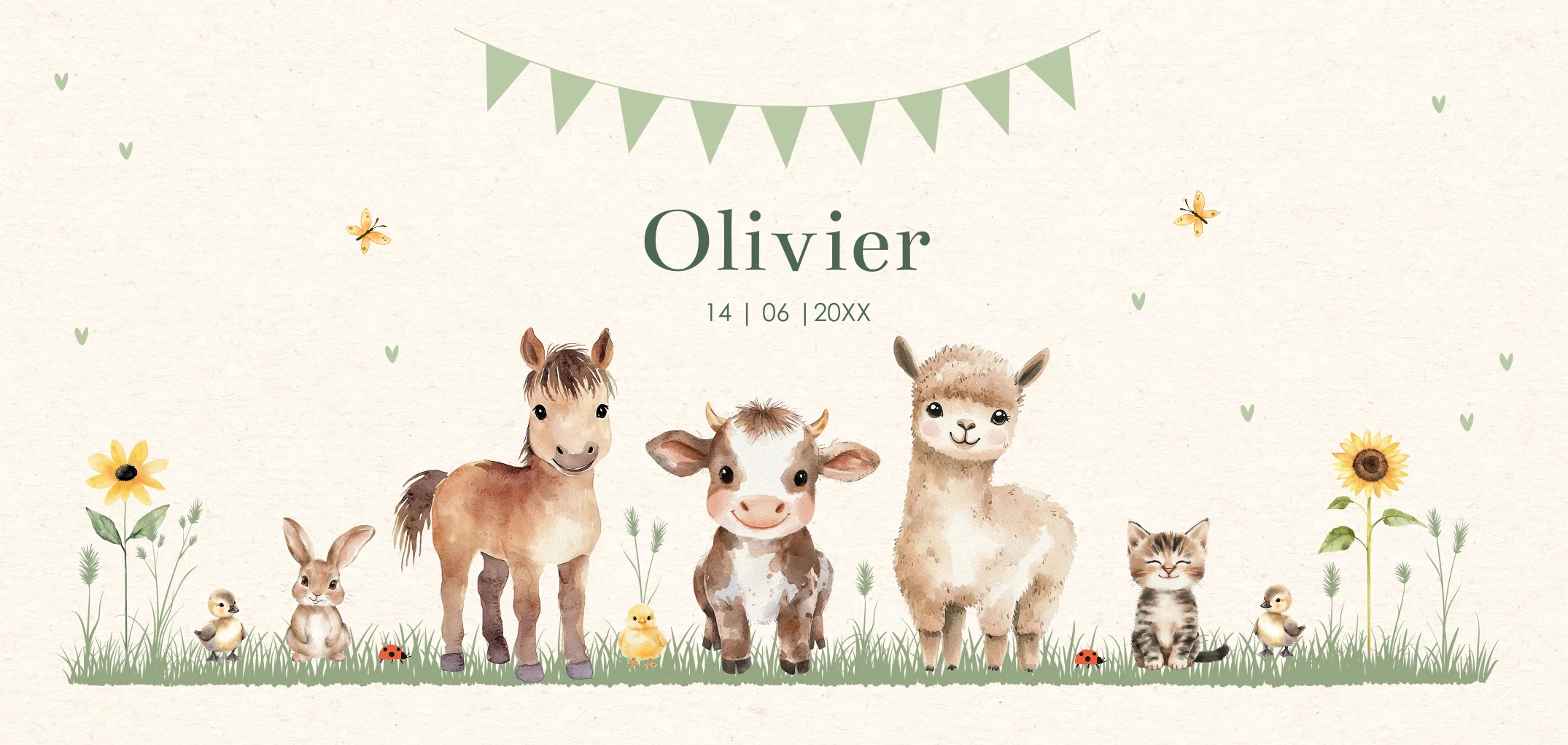 Geboortekaartje langwerpig met boerderij dieren paard, koe, lama, eendje en bloemen. Kies voor dit superleuke geboortekaartje met dieren en gekleurde slinger.