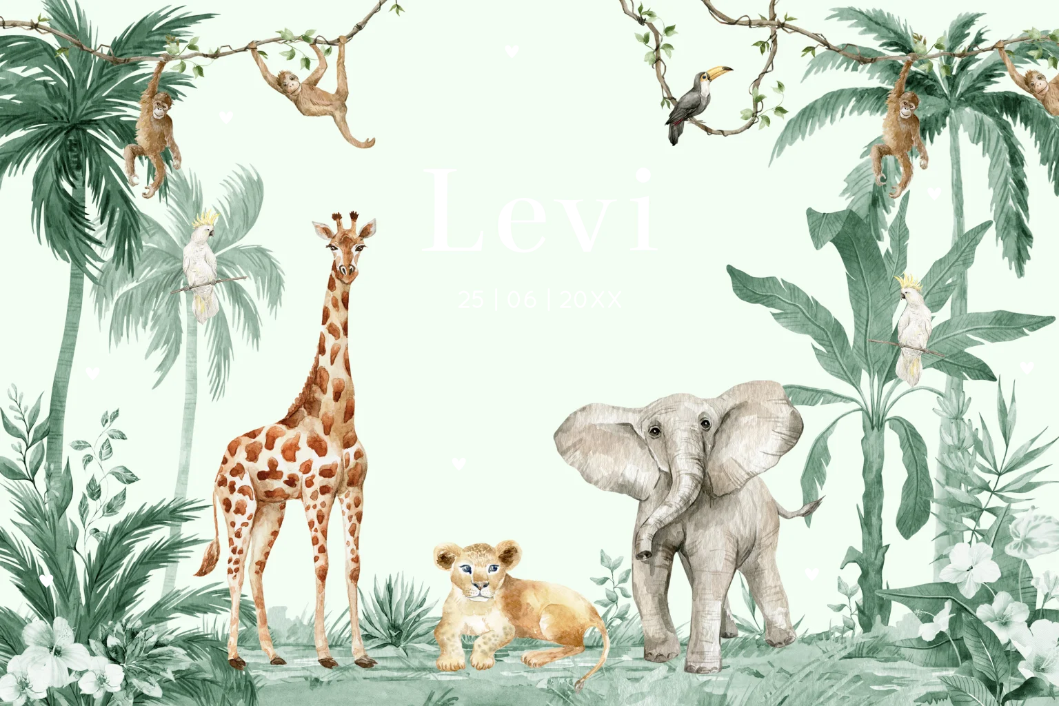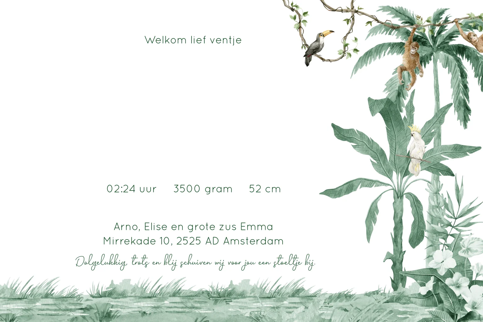 Geboortekaartje groen voor een jongen met jungle dieren, olifantje, giraffe, leeuwtje, aapjes, vogels, palmbomen en goudfolie.
