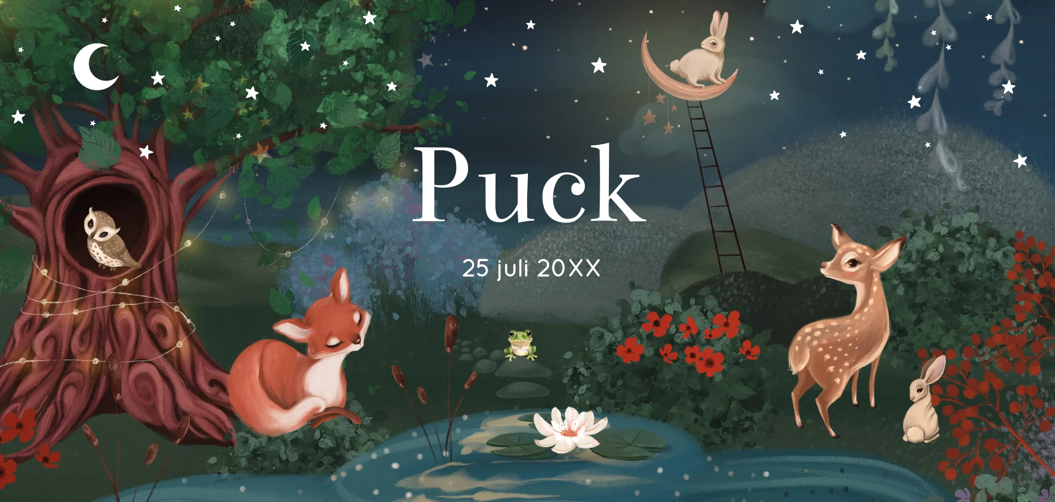 Geboortekaartje panorama met bosdieren in de nacht met sterren en goudfolie. Kies voor dit prachtige magische geboortekaartje met boom, maan, sterren, hertje, vosje, uiltje en konijn.